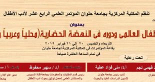 المؤتمر العلمى الرابع عشر لأدب الأطفال بالمكتبة المركزية لجامعة حلوان يومي20 ، 21 فبراير2019 تحت عنوان ” أدب الأطفال العالمى ودوره فى النهضة الحضارية (محليا وعربيا وعالميا)” ينظم معمل توثيق بحوث أدب الأطفال بالمكتبة المركزية لجامعة حلوان مؤتمره السنوى الرابع عشر بعنوان ” أدب الأطفال ودوره فى النهضة الحضارية (محليا وعربيا وعالميا)” وذلك تحت رعاية السيد/أ.د ماجد محمد فهمى نجم رئيس الجامعة …