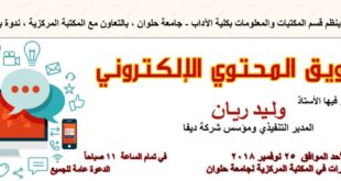 ينظم قسم المكتبات والمعلومات بكلية الآداب – جامعة حلوان ، بالتعاون مع المكتبة المركزية ، ندوة بعنوان: تسويق المحتوي الإلكتروني يحاضر فيها الأستاذ وليد ريان المدير التنفيذي ومؤسس شركة ديفا يوم الأحد الموافق 25 نوفمبر 2018 ، بقاعة المؤتمرات في المكتبة المركزية لجامعة حلوان في تمام الساعة 11 صباحا الدعوة عامة للجميع